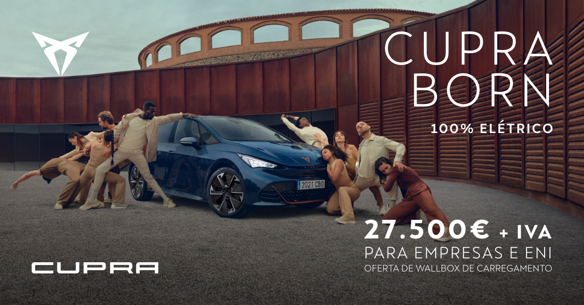 * Campanha válida para Empresas e ENI – negócios fechados – até 30/03/2026 e limitada ao stock existente. Valor para CUPRA Born 59kWh 204cv. Consumo combinado WLTP (kWh/100km): 15,5-17,3. Emissões CO2 (g/km): 0. Os valores de consumo elétrico indicados podem variar em função do equipamento selecionado. Imagem não contratual.