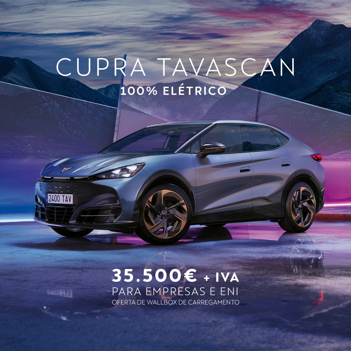 * Campanha válida para Empresas e ENI – negócios fechados – até 30/04/2026 e limitada ao stock existente. Valor para CUPRA Tavascan 77 kWh Endurance 286cv. Consumo combinado WLTP (kWh/100km): 15,9-17,7. Emissões CO2 (g/km): 0. Os valores de consumo elétrico indicados podem variar em função do equipamento selecionado. Imagem não contratual.